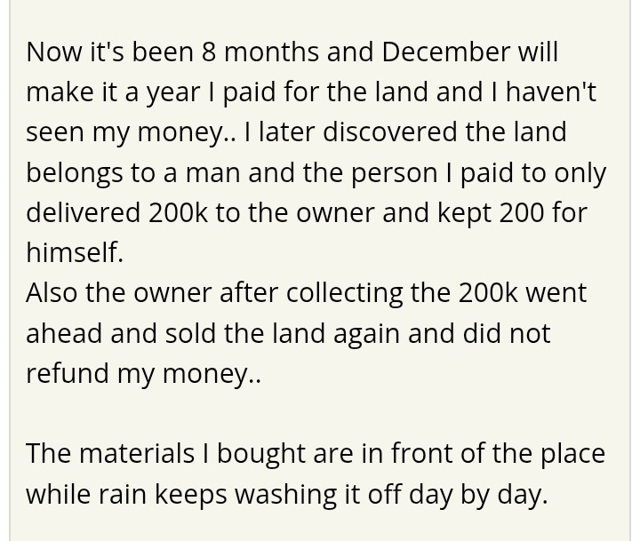 “I later discovered the land belongs to a man and the person I paid to only delivered 200k to the owner and kept 200k for himself. … Also the owner after collecting the 200k went ahead and sold the land again and did not refund my money. … This happened in Ijoko Ogun state.”