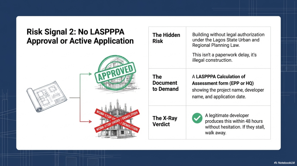 | WHY THESE SIGNALS MATTER The Lagos real estate market has regulatory layers that most investors outside the industry never see. LASPPPA approvals, C-of-O file verification, COREN-registered engineering oversight, these are not formalities. They are the paper trail that separates a legally compliant project from one that can be work-stopped, demolished, or abandoned without legal consequence to the developer. The checks below draw on the specific documentation that legitimate Lagos developers produce as a matter of course. If a project cannot produce these documents, that is not a paperwork delay. It is a signal. |