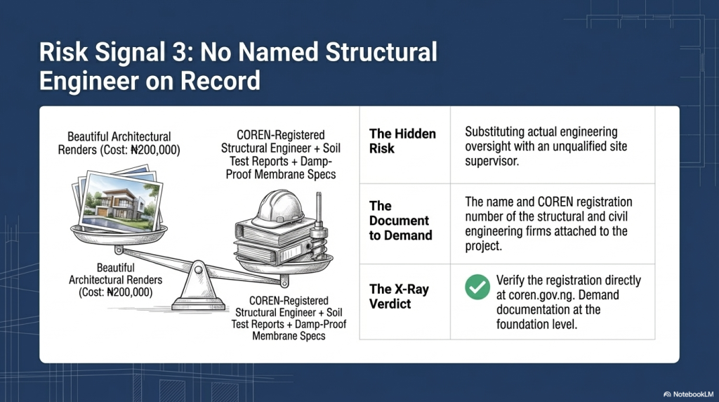 Beautiful architectural renders cost at minimum ₦200,000 to produce. A COREN-registered structural engineer willing to put their name and licence number on a building costs significantly more, and is worth every naira.